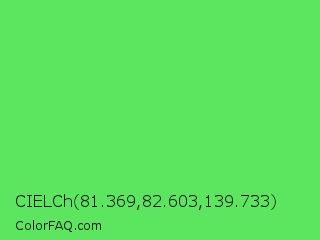 CIELCh 81.369,82.603,139.733 Color is a light green color and the nearest color is Screamin Green #66ff66. Hex code #5ce55f and RGB value is rgb(92,229,95). In RGB color space, this color is composed of 36% red, 90% green, 37% blue, In CMYK color space, this color is composed of 60% cyan, 0% magenta, 59% yellow , 10% black , In HSL color space, this color has a hue angle of 121° , 72% saturation and 63% lightness.