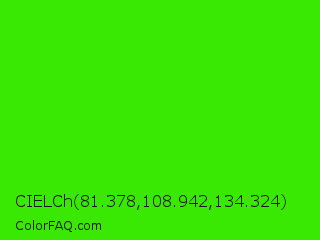 CIELCh 81.378,108.942,134.324 Color is a normal green color and the nearest color is Harlequin #3fff00. Hex code #39e904 and RGB value is rgb(57,233,4). In RGB color space, this color is composed of 22% red, 91% green, 2% blue, In CMYK color space, this color is composed of 76% cyan, 0% magenta, 98% yellow , 9% black , In HSL color space, this color has a hue angle of 106° , 97% saturation and 46% lightness.