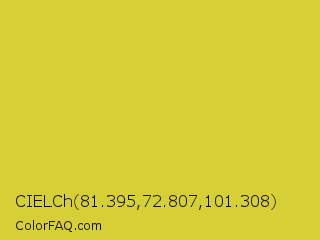CIELCh 81.395,72.807,101.308 Color is a normal yellow color and the nearest color is Wattle #dcd747. Hex code #d6cf36 and RGB value is rgb(214,207,54). In RGB color space, this color is composed of 84% red, 81% green, 21% blue, In CMYK color space, this color is composed of 0% cyan, 3% magenta, 75% yellow , 16% black , In HSL color space, this color has a hue angle of 57° , 66% saturation and 53% lightness.