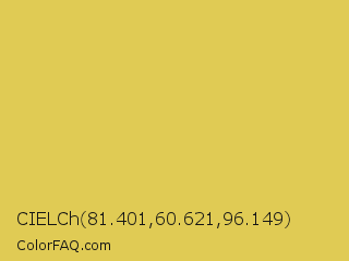 CIELCh 81.401,60.621,96.149 Color is a normal yellow color and the nearest color is Ronchi #ecc54e. Hex code #e0cb54 and RGB value is rgb(224,203,84). In RGB color space, this color is composed of 88% red, 80% green, 33% blue, In CMYK color space, this color is composed of 0% cyan, 9% magenta, 63% yellow , 12% black , In HSL color space, this color has a hue angle of 51° , 69% saturation and 60% lightness.