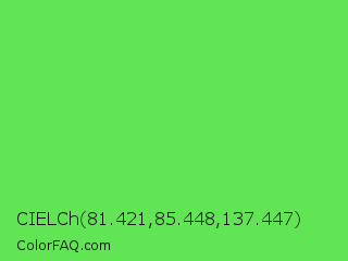 CIELCh 81.421,85.448,137.447 Color is a light green color and the nearest color is Screamin Green #66ff66. Hex code #61e555 and RGB value is rgb(97,229,85). In RGB color space, this color is composed of 38% red, 90% green, 33% blue, In CMYK color space, this color is composed of 58% cyan, 0% magenta, 63% yellow , 10% black , In HSL color space, this color has a hue angle of 115° , 73% saturation and 62% lightness.