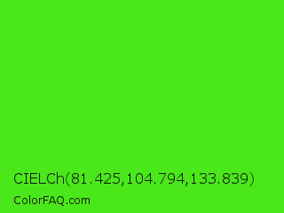 CIELCh 81.425,104.794,133.839 Color is a normal green color and the nearest color is Neon Green #39ff14. Hex code #4ae81a and RGB value is rgb(74,232,26). In RGB color space, this color is composed of 29% red, 91% green, 10% blue, In CMYK color space, this color is composed of 68% cyan, 0% magenta, 89% yellow , 9% black , In HSL color space, this color has a hue angle of 106° , 82% saturation and 51% lightness.