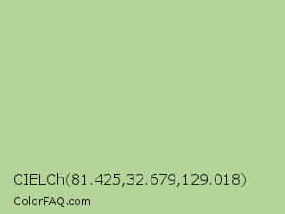 CIELCh 81.425,32.679,129.018 Color is a light green color and the nearest color is Granny Smith Apple #a8e4a0. Hex code #b5d49a and RGB value is rgb(181,212,154). In RGB color space, this color is composed of 71% red, 83% green, 60% blue, In CMYK color space, this color is composed of 15% cyan, 0% magenta, 27% yellow , 17% black , In HSL color space, this color has a hue angle of 92° , 40% saturation and 72% lightness.