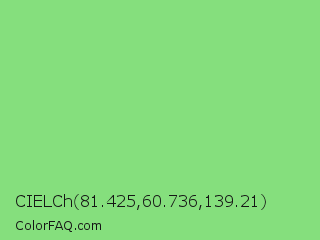 CIELCh 81.425,60.736,139.21 Color is a light green color and the nearest color is Pastel Green #77dd77. Hex code #85df7d and RGB value is rgb(133,223,125). In RGB color space, this color is composed of 52% red, 87% green, 49% blue, In CMYK color space, this color is composed of 40% cyan, 0% magenta, 44% yellow , 13% black , In HSL color space, this color has a hue angle of 115° , 60% saturation and 68% lightness.