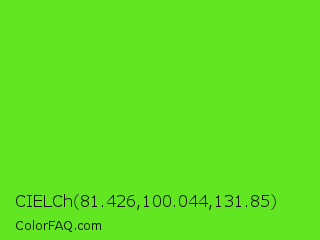 CIELCh 81.426,100.044,131.85 Color is a normal green color and the nearest color is Harlequin Green #46cb18. Hex code #61e621 and RGB value is rgb(97,230,33). In RGB color space, this color is composed of 38% red, 90% green, 13% blue, In CMYK color space, this color is composed of 58% cyan, 0% magenta, 86% yellow , 10% black , In HSL color space, this color has a hue angle of 101° , 80% saturation and 52% lightness.