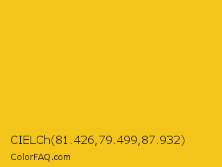 CIELCh 81.426,79.499,87.932 Color is a normal yellow color and the nearest color is Deep Lemon #f5c71a. Hex code #f4c51b and RGB value is rgb(244,197,27). In RGB color space, this color is composed of 96% red, 77% green, 11% blue, In CMYK color space, this color is composed of 0% cyan, 19% magenta, 89% yellow , 4% black , In HSL color space, this color has a hue angle of 47° , 91% saturation and 53% lightness.