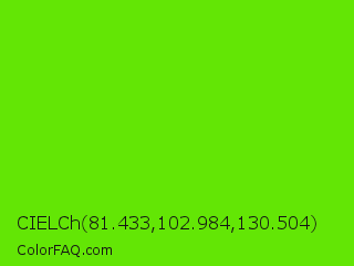 CIELCh 81.433,102.984,130.504 Color is a normal green color and the nearest color is Bright Green #66ff00. Hex code #63e605 and RGB value is rgb(99,230,5). In RGB color space, this color is composed of 39% red, 90% green, 2% blue, In CMYK color space, this color is composed of 57% cyan, 0% magenta, 98% yellow , 10% black , In HSL color space, this color has a hue angle of 95° , 96% saturation and 46% lightness.