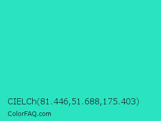 CIELCh 81.446,51.688,175.403 Color is a normal cyan color and the nearest color is Turquoise PWG #30d5c8. Hex code #2ae3c1 and RGB value is rgb(42,227,193). In RGB color space, this color is composed of 16% red, 89% green, 76% blue, In CMYK color space, this color is composed of 81% cyan, 0% magenta, 15% yellow , 11% black , In HSL color space, this color has a hue angle of 169° , 77% saturation and 53% lightness.
