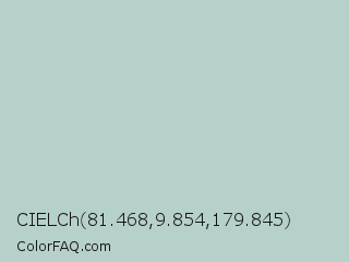 CIELCh 81.468,9.854,179.845 Color is a light cyan color and the nearest color is Jet Stream #b5d2ce. Hex code #b6d0ca and RGB value is rgb(182,208,202). In RGB color space, this color is composed of 71% red, 82% green, 79% blue, In CMYK color space, this color is composed of 13% cyan, 0% magenta, 3% yellow , 18% black , In HSL color space, this color has a hue angle of 166° , 22% saturation and 76% lightness.