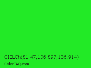 CIELCh 81.47,106.897,136.914 Color is a normal green color and the nearest color is Lime Green #32cd32. Hex code #22ea26 and RGB value is rgb(34,234,38). In RGB color space, this color is composed of 13% red, 92% green, 15% blue, In CMYK color space, this color is composed of 85% cyan, 0% magenta, 84% yellow , 8% black , In HSL color space, this color has a hue angle of 121° , 83% saturation and 53% lightness.
