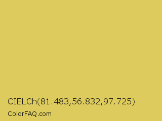 CIELCh 81.483,56.832,97.725 Color is a light yellow color and the nearest color is Tacha #d6c562. Hex code #ddcc5d and RGB value is rgb(221,204,93). In RGB color space, this color is composed of 87% red, 80% green, 36% blue, In CMYK color space, this color is composed of 0% cyan, 8% magenta, 58% yellow , 13% black , In HSL color space, this color has a hue angle of 52° , 65% saturation and 62% lightness.