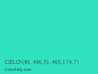 CIELCh 81.496,51.465,174.7 Color is a normal cyan color and the nearest color is Turquoise PWG #30d5c8. Hex code #30e3c0 and RGB value is rgb(48,227,192). In RGB color space, this color is composed of 19% red, 89% green, 75% blue, In CMYK color space, this color is composed of 79% cyan, 0% magenta, 15% yellow , 11% black , In HSL color space, this color has a hue angle of 168° , 76% saturation and 54% lightness.