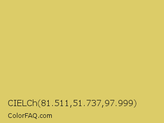 CIELCh 81.511,51.737,97.999 Color is a light yellow color and the nearest color is Chenin #dfcd6f. Hex code #dccc68 and RGB value is rgb(220,204,104). In RGB color space, this color is composed of 86% red, 80% green, 41% blue, In CMYK color space, this color is composed of 0% cyan, 7% magenta, 53% yellow , 14% black , In HSL color space, this color has a hue angle of 52° , 62% saturation and 64% lightness.
