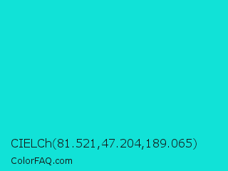 CIELCh 81.521,47.204,189.065 Color is a normal cyan color and the nearest color is Bright Turquoise #08e8de. Hex code #11e2d7 and RGB value is rgb(17,226,215). In RGB color space, this color is composed of 7% red, 89% green, 84% blue, In CMYK color space, this color is composed of 92% cyan, 0% magenta, 5% yellow , 11% black , In HSL color space, this color has a hue angle of 177° , 86% saturation and 48% lightness.