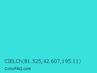 CIELCh 81.525,42.607,195.11 Color is a normal cyan color and the nearest color is Turquoise #40e0d0. Hex code #38e0de and RGB value is rgb(56,224,222). In RGB color space, this color is composed of 22% red, 88% green, 87% blue, In CMYK color space, this color is composed of 75% cyan, 0% magenta, 1% yellow , 12% black , In HSL color space, this color has a hue angle of 179° , 73% saturation and 55% lightness.