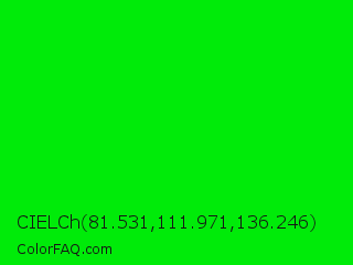 CIELCh 81.531,111.971,136.246 Color is a normal green color and the nearest color is Green #00ff00. Hex code #00eb09 and RGB value is rgb(0,235,9). In RGB color space, this color is composed of 0% red, 92% green, 4% blue, In CMYK color space, this color is composed of 100% cyan, 0% magenta, 96% yellow , 8% black , In HSL color space, this color has a hue angle of 122° , 100% saturation and 46% lightness.