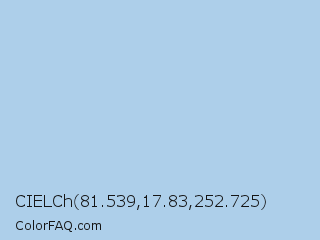 CIELCh 81.539,17.83,252.725 Color is a light blue color and the nearest color is Pale Cornflower Blue #abcdef. Hex code #adcfea and RGB value is rgb(173,207,234). In RGB color space, this color is composed of 68% red, 81% green, 92% blue, In CMYK color space, this color is composed of 26% cyan, 12% magenta, 0% yellow , 8% black , In HSL color space, this color has a hue angle of 207° , 59% saturation and 80% lightness.