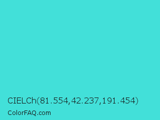 CIELCh 81.554,42.237,191.454 Color is a normal cyan color and the nearest color is Turquoise #40e0d0. Hex code #42e0d9 and RGB value is rgb(66,224,217). In RGB color space, this color is composed of 26% red, 88% green, 85% blue, In CMYK color space, this color is composed of 71% cyan, 0% magenta, 3% yellow , 12% black , In HSL color space, this color has a hue angle of 177° , 72% saturation and 57% lightness.