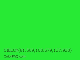 CIELCh 81.569,103.679,137.933 Color is a normal green color and the nearest color is Lime Green #32cd32. Hex code #26ea34 and RGB value is rgb(38,234,52). In RGB color space, this color is composed of 15% red, 92% green, 20% blue, In CMYK color space, this color is composed of 84% cyan, 0% magenta, 78% yellow , 8% black , In HSL color space, this color has a hue angle of 124° , 82% saturation and 53% lightness.