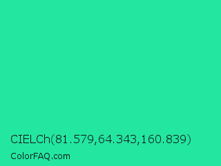 CIELCh 81.579,64.343,160.839 Color is a normal green color and the nearest color is Shamrock #33cc99. Hex code #23e6a1 and RGB value is rgb(35,230,161). In RGB color space, this color is composed of 14% red, 90% green, 63% blue, In CMYK color space, this color is composed of 85% cyan, 0% magenta, 30% yellow , 10% black , In HSL color space, this color has a hue angle of 159° , 80% saturation and 52% lightness.