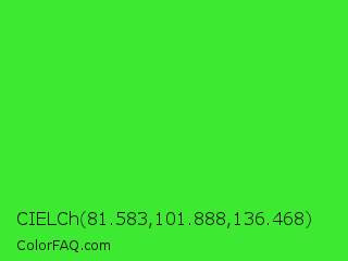 CIELCh 81.583,101.888,136.468 Color is a normal green color and the nearest color is Lime Green #32cd32. Hex code #3ee932 and RGB value is rgb(62,233,50). In RGB color space, this color is composed of 24% red, 91% green, 20% blue, In CMYK color space, this color is composed of 73% cyan, 0% magenta, 79% yellow , 9% black , In HSL color space, this color has a hue angle of 116° , 81% saturation and 55% lightness.