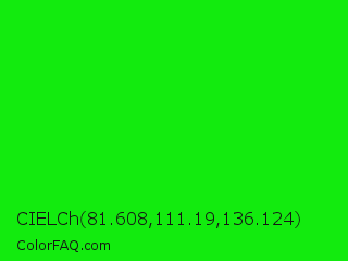 CIELCh 81.608,111.19,136.124 Color is a normal green color and the nearest color is Green #00ff00. Hex code #12eb0e and RGB value is rgb(18,235,14). In RGB color space, this color is composed of 7% red, 92% green, 5% blue, In CMYK color space, this color is composed of 92% cyan, 0% magenta, 94% yellow , 8% black , In HSL color space, this color has a hue angle of 119° , 89% saturation and 49% lightness.