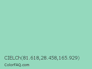 CIELCh 81.618,28.458,165.929 Color is a light green color and the nearest color is Algae Green #93dfb8. Hex code #94d9bd and RGB value is rgb(148,217,189). In RGB color space, this color is composed of 58% red, 85% green, 74% blue, In CMYK color space, this color is composed of 32% cyan, 0% magenta, 13% yellow , 15% black , In HSL color space, this color has a hue angle of 156° , 48% saturation and 72% lightness.