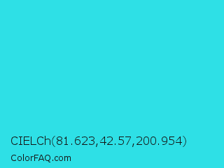 CIELCh 81.623,42.57,200.954 Color is a normal cyan color and the nearest color is Turquoise #40e0d0. Hex code #2ee0e6 and RGB value is rgb(46,224,230). In RGB color space, this color is composed of 18% red, 88% green, 90% blue, In CMYK color space, this color is composed of 80% cyan, 3% magenta, 0% yellow , 10% black , In HSL color space, this color has a hue angle of 182° , 79% saturation and 54% lightness.