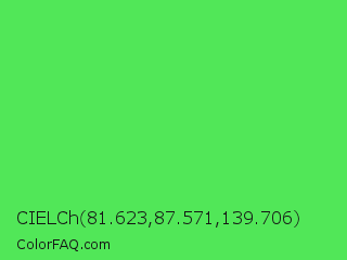 CIELCh 81.623,87.571,139.706 Color is a light green color and the nearest color is Screamin Green #66ff66. Hex code #51e758 and RGB value is rgb(81,231,88). In RGB color space, this color is composed of 32% red, 91% green, 35% blue, In CMYK color space, this color is composed of 65% cyan, 0% magenta, 62% yellow , 9% black , In HSL color space, this color has a hue angle of 123° , 76% saturation and 61% lightness.