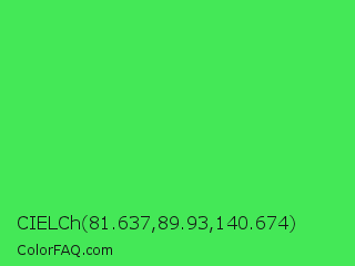 CIELCh 81.637,89.93,140.674 Color is a normal green color and the nearest color is UFO Green #3cd070. Hex code #44e857 and RGB value is rgb(68,232,87). In RGB color space, this color is composed of 27% red, 91% green, 34% blue, In CMYK color space, this color is composed of 71% cyan, 0% magenta, 63% yellow , 9% black , In HSL color space, this color has a hue angle of 127° , 78% saturation and 59% lightness.