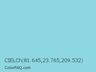 CIELCh 81.645,23.765,209.532 Color is a light cyan color and the nearest color is Sky Blue #87ceeb. Hex code #8dd7e0 and RGB value is rgb(141,215,224). In RGB color space, this color is composed of 55% red, 84% green, 88% blue, In CMYK color space, this color is composed of 37% cyan, 4% magenta, 0% yellow , 12% black , In HSL color space, this color has a hue angle of 187° , 57% saturation and 72% lightness.
