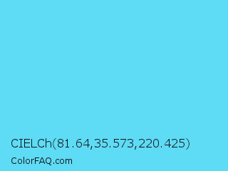 CIELCh 81.64,35.573,220.425 Color is a light cyan color and the nearest color is Turquoise Blue #6cdae7. Hex code #5edbf5 and RGB value is rgb(94,219,245). In RGB color space, this color is composed of 37% red, 86% green, 96% blue, In CMYK color space, this color is composed of 62% cyan, 11% magenta, 0% yellow , 4% black , In HSL color space, this color has a hue angle of 190° , 88% saturation and 66% lightness.
