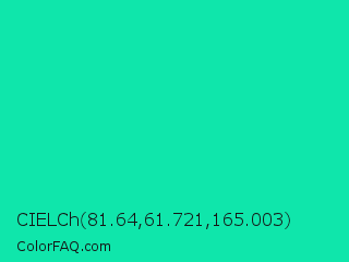 CIELCh 81.64,61.721,165.003 Color is a normal cyan color and the nearest color is Medium Spring Green #00fa9a. Hex code #0fe6ab and RGB value is rgb(15,230,171). In RGB color space, this color is composed of 6% red, 90% green, 67% blue, In CMYK color space, this color is composed of 93% cyan, 0% magenta, 26% yellow , 10% black , In HSL color space, this color has a hue angle of 164° , 88% saturation and 48% lightness.