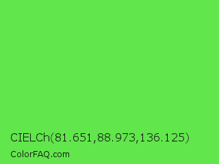 CIELCh 81.651,88.973,136.125 Color is a normal green color and the nearest color is Screamin Green #66ff66. Hex code #61e64c and RGB value is rgb(97,230,76). In RGB color space, this color is composed of 38% red, 90% green, 30% blue, In CMYK color space, this color is composed of 58% cyan, 0% magenta, 67% yellow , 10% black , In HSL color space, this color has a hue angle of 112° , 75% saturation and 60% lightness.