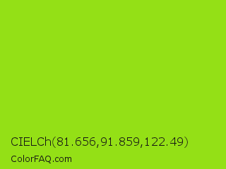 CIELCh 81.656,91.859,122.49 Color is a normal green color and the nearest color is Vivid Lime Green #a6d608. Hex code #94e016 and RGB value is rgb(148,224,22). In RGB color space, this color is composed of 58% red, 88% green, 9% blue, In CMYK color space, this color is composed of 34% cyan, 0% magenta, 90% yellow , 12% black , In HSL color space, this color has a hue angle of 83° , 82% saturation and 48% lightness.