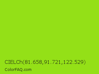 CIELCh 81.658,91.721,122.529 Color is a normal green color and the nearest color is Vivid Lime Green #a6d608. Hex code #94e017 and RGB value is rgb(148,224,23). In RGB color space, this color is composed of 58% red, 88% green, 9% blue, In CMYK color space, this color is composed of 34% cyan, 0% magenta, 90% yellow , 12% black , In HSL color space, this color has a hue angle of 83° , 81% saturation and 48% lightness.