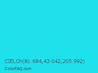 CIELCh 81.684,43.042,205.992 Color is a normal cyan color and the nearest color is Loeen #15f2fd. Hex code #1fe0ed and RGB value is rgb(31,224,237). In RGB color space, this color is composed of 12% red, 88% green, 93% blue, In CMYK color space, this color is composed of 87% cyan, 5% magenta, 0% yellow , 7% black , In HSL color space, this color has a hue angle of 184° , 85% saturation and 53% lightness.