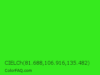 CIELCh 81.688,106.916,135.482 Color is a normal green color and the nearest color is Neon Green #39ff14. Hex code #36ea1e and RGB value is rgb(54,234,30). In RGB color space, this color is composed of 21% red, 92% green, 12% blue, In CMYK color space, this color is composed of 77% cyan, 0% magenta, 87% yellow , 8% black , In HSL color space, this color has a hue angle of 113° , 83% saturation and 52% lightness.