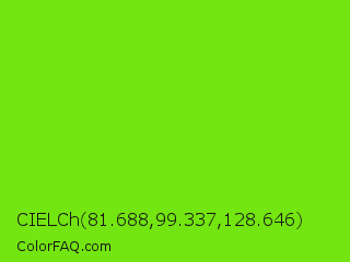 CIELCh 81.688,99.337,128.646 Color is a normal green color and the nearest color is Alien Armpit #84de02. Hex code #73e511 and RGB value is rgb(115,229,17). In RGB color space, this color is composed of 45% red, 90% green, 7% blue, In CMYK color space, this color is composed of 50% cyan, 0% magenta, 93% yellow , 10% black , In HSL color space, this color has a hue angle of 92° , 86% saturation and 48% lightness.