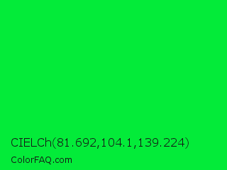 CIELCh 81.692,104.1,139.224 Color is a normal green color and the nearest color is Malachite #0bda51. Hex code #03eb39 and RGB value is rgb(3,235,57). In RGB color space, this color is composed of 1% red, 92% green, 22% blue, In CMYK color space, this color is composed of 99% cyan, 0% magenta, 76% yellow , 8% black , In HSL color space, this color has a hue angle of 134° , 97% saturation and 47% lightness.