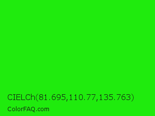 CIELCh 81.695,110.77,135.763 Color is a normal green color and the nearest color is Neon Green #39ff14. Hex code #1feb0d and RGB value is rgb(31,235,13). In RGB color space, this color is composed of 12% red, 92% green, 5% blue, In CMYK color space, this color is composed of 87% cyan, 0% magenta, 94% yellow , 8% black , In HSL color space, this color has a hue angle of 115° , 90% saturation and 49% lightness.