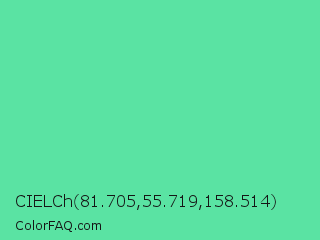 CIELCh 81.705,55.719,158.514 Color is a light green color and the nearest color is Medium Aquamarine #66ddaa. Hex code #5ae3a3 and RGB value is rgb(90,227,163). In RGB color space, this color is composed of 35% red, 89% green, 64% blue, In CMYK color space, this color is composed of 60% cyan, 0% magenta, 28% yellow , 11% black , In HSL color space, this color has a hue angle of 152° , 71% saturation and 62% lightness.