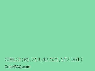 CIELCh 81.714,42.521,157.261 Color is a light green color and the nearest color is Vista Blue #8fd6b4. Hex code #80deab and RGB value is rgb(128,222,171). In RGB color space, this color is composed of 50% red, 87% green, 67% blue, In CMYK color space, this color is composed of 42% cyan, 0% magenta, 23% yellow , 13% black , In HSL color space, this color has a hue angle of 147° , 59% saturation and 69% lightness.