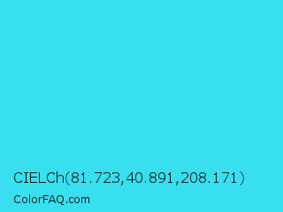 CIELCh 81.723,40.891,208.171 Color is a normal cyan color and the nearest color is Turquoise #40e0d0. Hex code #38dfee and RGB value is rgb(56,223,238). In RGB color space, this color is composed of 22% red, 87% green, 93% blue, In CMYK color space, this color is composed of 76% cyan, 6% magenta, 0% yellow , 7% black , In HSL color space, this color has a hue angle of 185° , 84% saturation and 58% lightness.