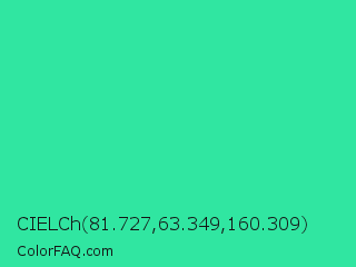 CIELCh 81.727,63.349,160.309 Color is a normal green color and the nearest color is Eucalyptus #44d7a8. Hex code #30e6a1 and RGB value is rgb(48,230,161). In RGB color space, this color is composed of 19% red, 90% green, 63% blue, In CMYK color space, this color is composed of 79% cyan, 0% magenta, 30% yellow , 10% black , In HSL color space, this color has a hue angle of 157° , 78% saturation and 55% lightness.