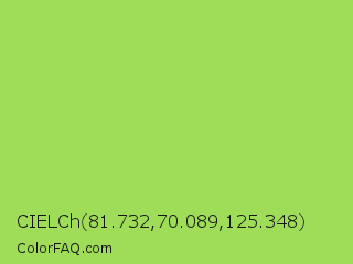 CIELCh 81.732,70.089,125.348 Color is a light green color and the nearest color is Conifer #acdd4d. Hex code #9fdd59 and RGB value is rgb(159,221,89). In RGB color space, this color is composed of 62% red, 87% green, 35% blue, In CMYK color space, this color is composed of 28% cyan, 0% magenta, 60% yellow , 13% black , In HSL color space, this color has a hue angle of 88° , 66% saturation and 61% lightness.