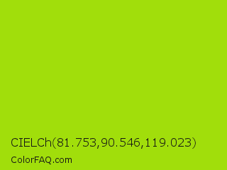 CIELCh 81.753,90.546,119.023 Color is a normal lime color and the nearest color is Vivid Lime Green #a6d608. Hex code #a1de0b and RGB value is rgb(161,222,11). In RGB color space, this color is composed of 63% red, 87% green, 4% blue, In CMYK color space, this color is composed of 27% cyan, 0% magenta, 95% yellow , 13% black , In HSL color space, this color has a hue angle of 77° , 91% saturation and 46% lightness.