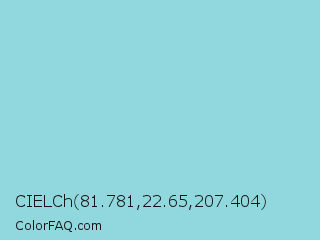 CIELCh 81.781,22.65,207.404 Color is a light cyan color and the nearest color is Morning Glory #9edee0. Hex code #91d7de and RGB value is rgb(145,215,222). In RGB color space, this color is composed of 57% red, 84% green, 87% blue, In CMYK color space, this color is composed of 35% cyan, 3% magenta, 0% yellow , 13% black , In HSL color space, this color has a hue angle of 185° , 54% saturation and 72% lightness.