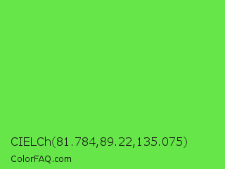 CIELCh 81.784,89.22,135.075 Color is a normal green color and the nearest color is Screamin Green #66ff66. Hex code #66e649 and RGB value is rgb(102,230,73). In RGB color space, this color is composed of 40% red, 90% green, 29% blue, In CMYK color space, this color is composed of 56% cyan, 0% magenta, 68% yellow , 10% black , In HSL color space, this color has a hue angle of 109° , 76% saturation and 59% lightness.