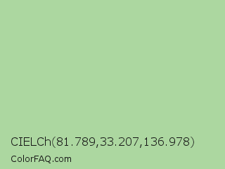 CIELCh 81.789,33.207,136.978 Color is a light green color and the nearest color is Granny Smith Apple #a8e4a0. Hex code #acd7a0 and RGB value is rgb(172,215,160). In RGB color space, this color is composed of 67% red, 84% green, 63% blue, In CMYK color space, this color is composed of 20% cyan, 0% magenta, 26% yellow , 16% black , In HSL color space, this color has a hue angle of 107° , 41% saturation and 74% lightness.